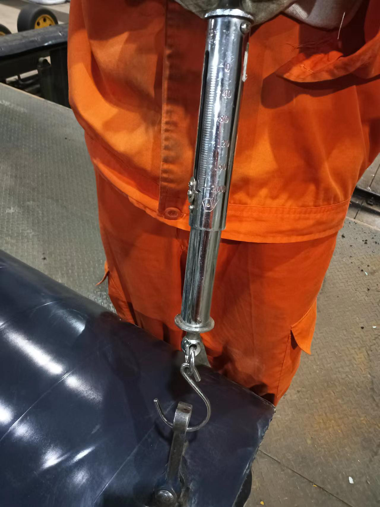 3、應先將熱收縮帶防腐層沿環(huán)向劃開寬度約為20mm、長100mm左右的長條, 劃開時應劃透防腐層直至所要測量的界面;撬起剝離條一端約20mm,將防腐層通過夾具固定在測力計的拉鉤上。