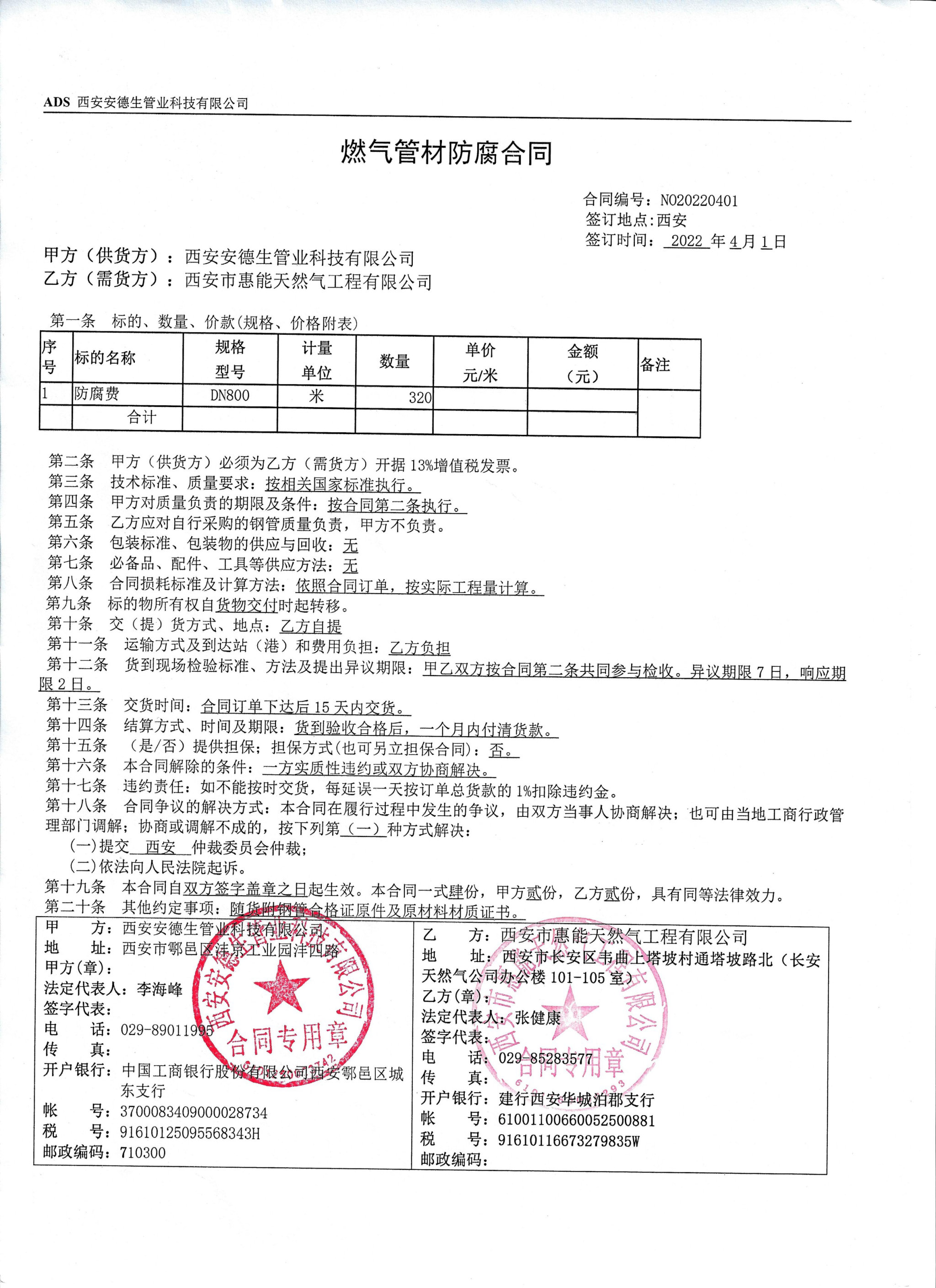 西安市惠能天然氣工程有限公司鋼管外防腐項(xiàng)目