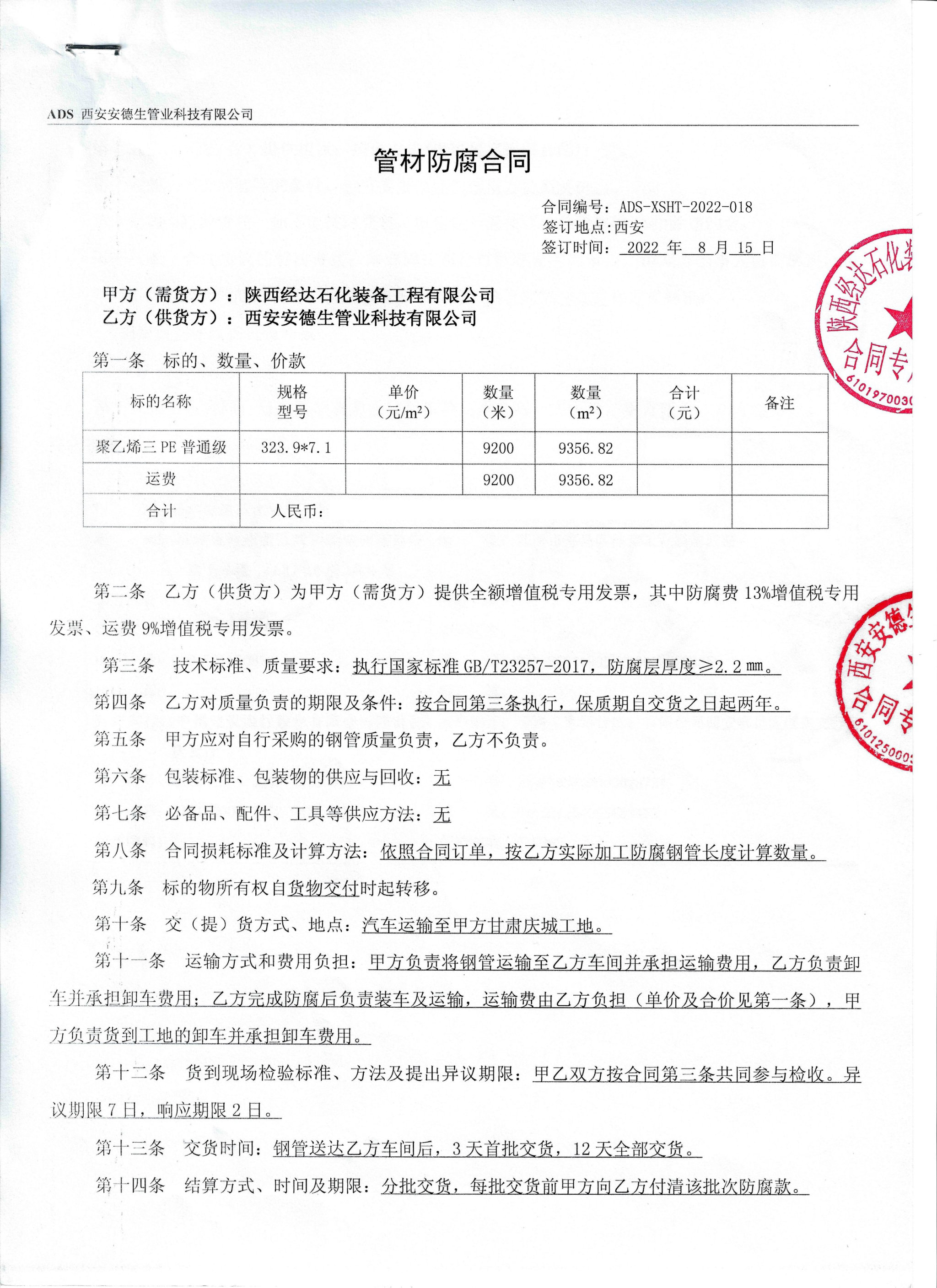 陜西經(jīng)達(dá)石化裝備工程有限公司鋼管外防腐項(xiàng)目